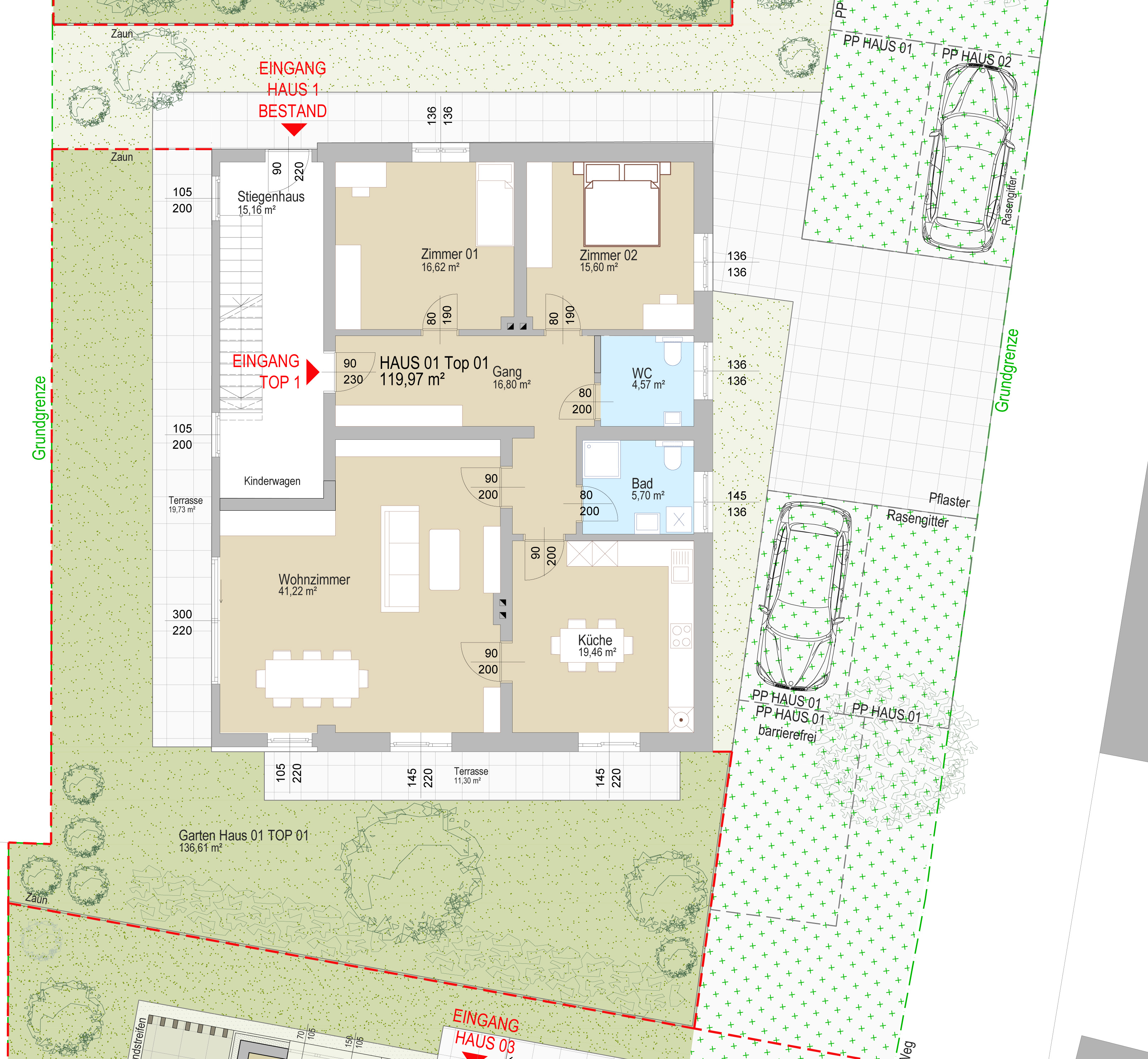 Das Bestandsgebäude (Haus 1 – TOP 1 & TOP 2) wird saniert